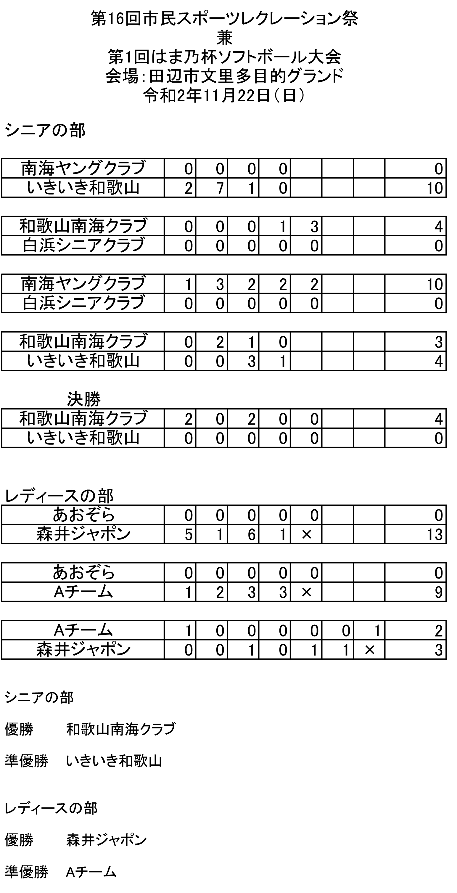 11月22日に、田辺市文里多目的グランドで第16回市民スポーツレクレーション祭 兼 第1回はま乃杯ソフトボール大会が開催されました。